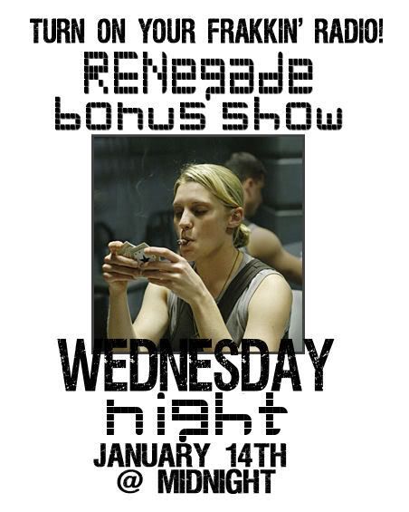 Dude, it's gonna be a Battlestar Galactica-themed RENegade show! This bonus show will take place next Wednesday night @ midnight. There will be a regular RENegade show at the usual time on the following Tuesday night.